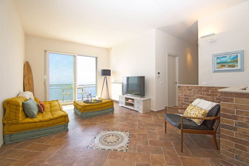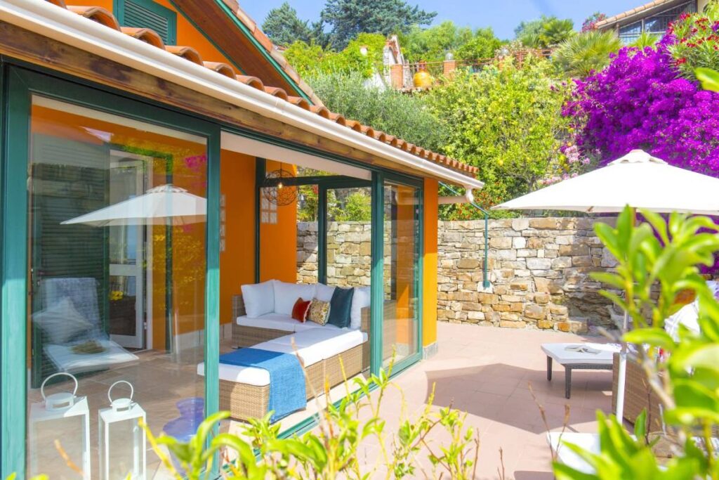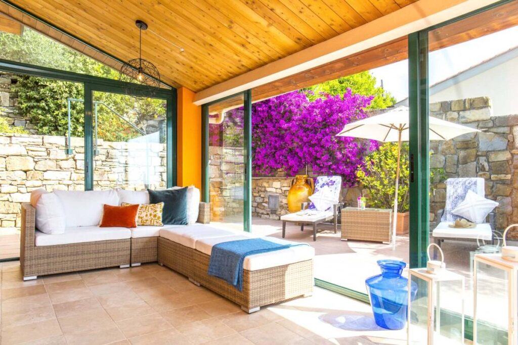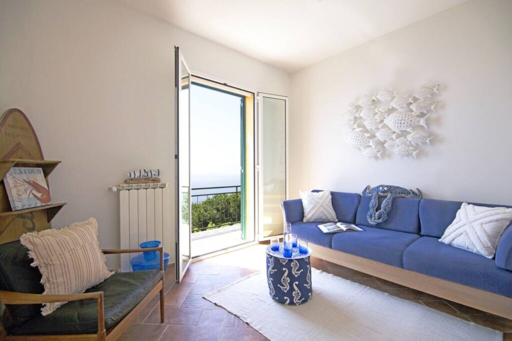 As you ascend the stone staircase, the scent of bougainvillea and lemon trees envelop you and you are greeted by the charming charm of traditional Ligurian architecture. Step through the glass veranda of the villa for sale in Cervo into a realm of comfort and elegance, where sunny spaces invite you to relax.