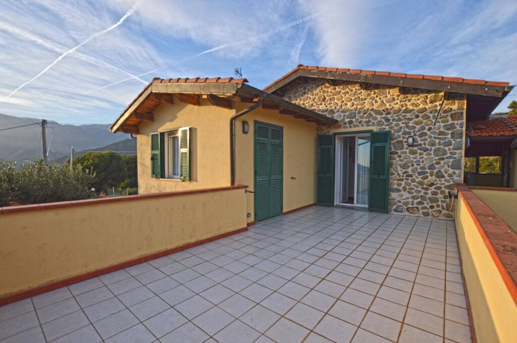 The beautiful country villa for sale in Ventimiglia is spread over 2 floors, with an olive grove at the entrance inviting you to enter the terrace of the ground floor apartment, which is actually divided into an entrance, a living room with open kitchen, a spacious dining room with large windows, 1 bedroom and 2 bathrooms. The upper floor, accessed by an external staircase, comprises a beautiful one bedroom apartment facing a large panoramic terrace with breathtaking views and a separate bedroom with en-suite bathroom enjoying a magnificent exposed wooden ceiling. The property also includes a wine cellar and a useful laundry room. With a perfect combination of well-organised spaces, bucolic details and a quirky layout, this villa for sale in Ventimiglia has excellent versatility to be occupied all year round by a large family or to be used as a profitable B&B business. This villa for sale in Ventimiglia combines the comforts of contemporary country living with the charm of the Ligurian countryside, making it the ideal place to enjoy the region’s characteristic sunsets.